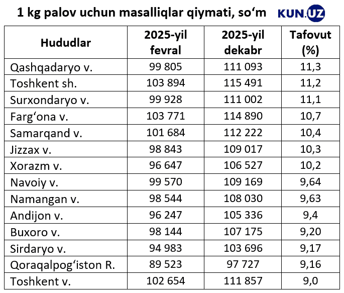 Kun.uz hisob-kitoblariga ko‘ra, masalan, yil boshida Qashqadaryoda 1 kg osh tayyorlash uchun 100 ming so‘m zarur bo‘lsa, dekabr oyida bu xarajat 111 ming so‘mga yetdi.