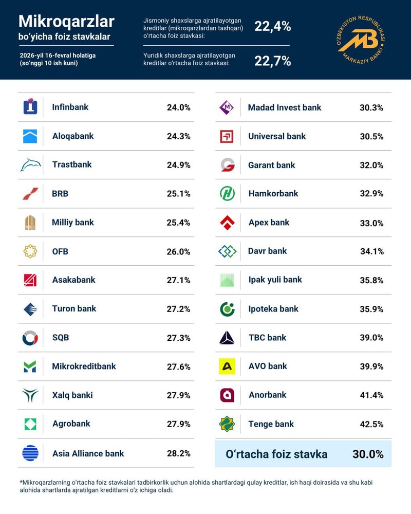 Markaziy bank e’lon qilgan ma’lumotlarga ko‘ra, tijorat banklarida mikroqarzlarning o‘rtacha foiz stavkasi 30% gacha pasaygan. Bu ko‘rsatkich so‘nggi yillarda qayd etilgan eng past darajalardan biri hisoblanadi.