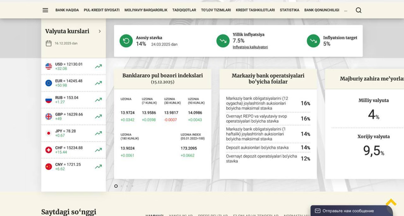 Ma’lumot uchun, Markaziy bank tomonidan e’lon qilinadigan rasmiy valyuta kurslari tashqi savdo operatsiyalarida muhim ahamiyat kasb etadi. Xususan, import va eksport shartnomalari, bojxona to‘lovlari, soliqlar hamda valyuta majburiyatlari aynan ushbu kurslar asosida hisoblab chiqiladi.