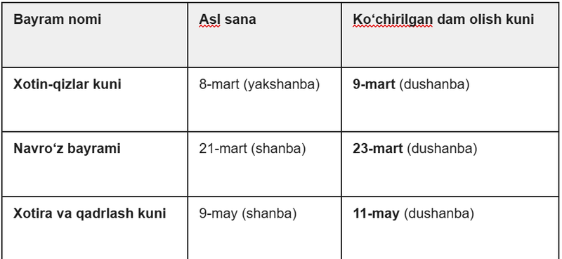 Muhim eslatma: Ushbu ko‘chirishlar tufayli o‘zbekistonliklar bayramlarda ketma-ket 3 kun dam olish imkoniyatiga ega bo‘ladilar.