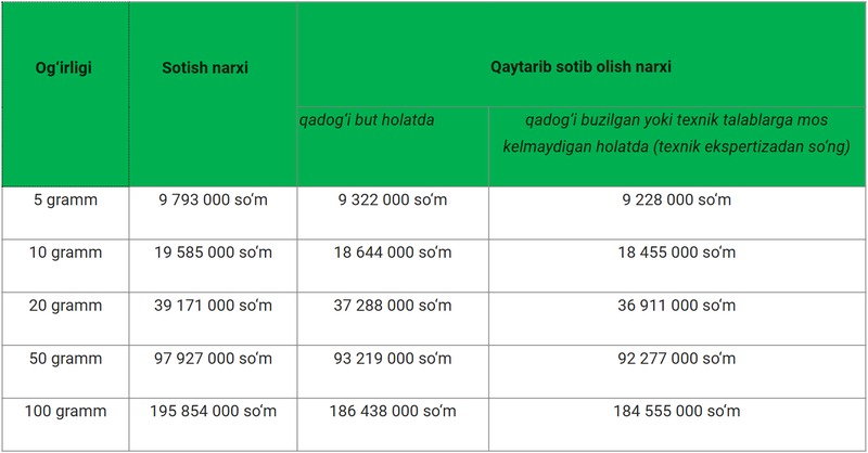 Markaziy bank ma’lumotlariga ko‘ra, oltin quymasini qaytarib sotib olish narxi uning qadog‘i butun bo‘lgan taqdirda sotish narxidan 5 foizga past belgilangan. Taqqoslash uchun, 22-yanvar kuni ushbu tafovut 4 foizni tashkil etgan.