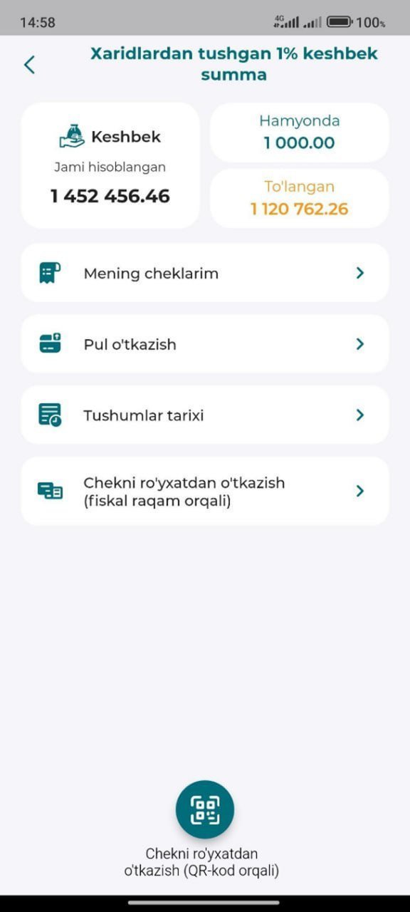 Ilovaning eng qiziqarli jihatlaridan biri — xarid qilganda olingan chekni skanerlash yoki QR kod orqali ro‘yxatdan o‘tkazish orqali pulni kichik qismini qaytarib olish (cashback) imkoniyati.