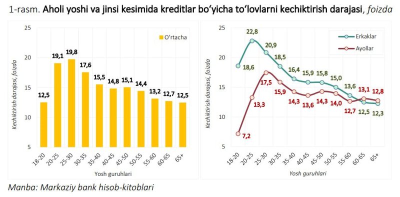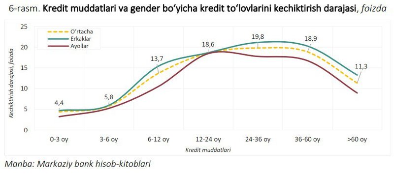 Gender kesimida esa erkaklarda kreditni kechiktirish holatlari ayollarga nisbatan yuqoriroq. Ayniqsa, 20–25 yosh oralig‘idagi har to‘rt erkakdan biri to‘lov jadvaliga amal qilmasligi qayd etilgan.