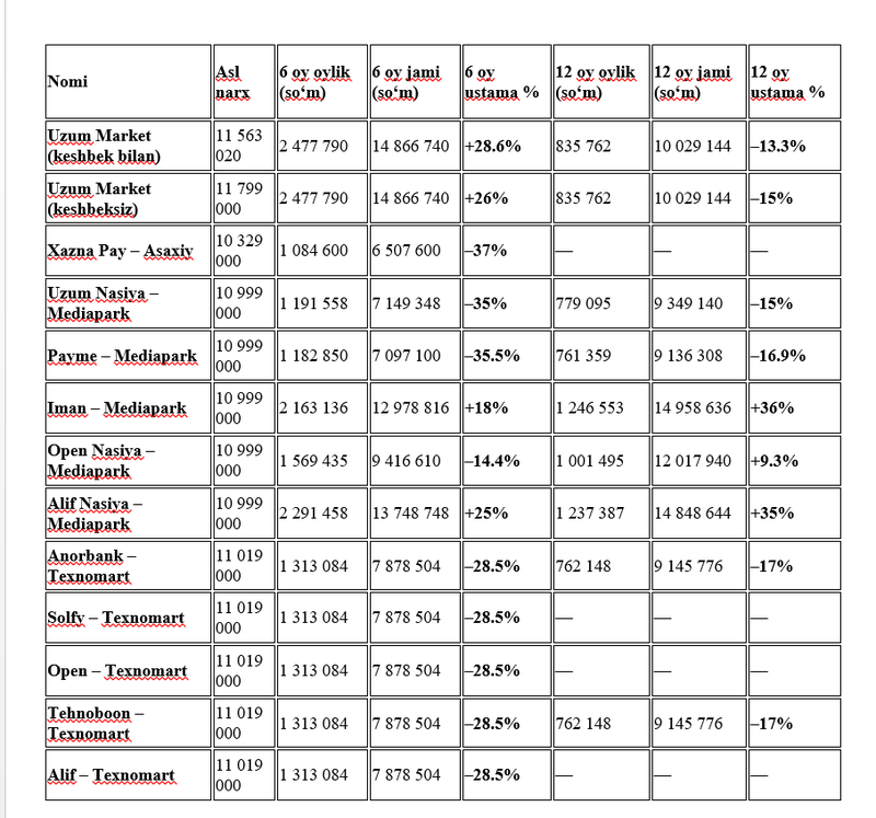 Oylik to‘lovlar: 3 oy – 2 031 400 so‘m, 6 oy – 1 084 600 so‘m, 9 oy – 860 800 so‘m