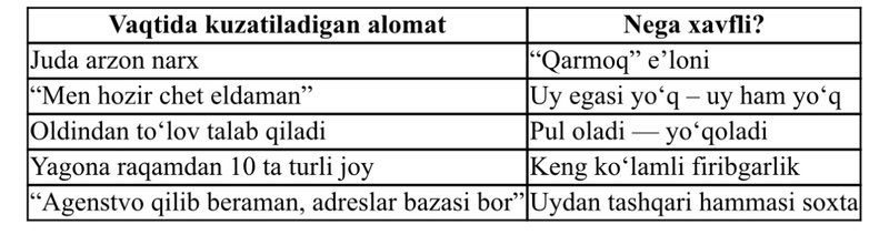 Uy egasi bilan shaxsan uchrashish, pasportni ko‘rsatishi shart. Uy hujjatini (kadastr) ko‘rishingiz kerak. To‘lovni faqat rasmiylashtirgandan so‘ng qilish kerak. “Oldindan pul yuboring — kalit beramiz” — 100% firibgarlik