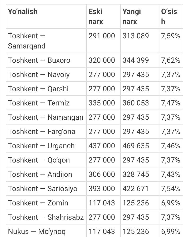 Eng yuqori narx o‘sishi Toshkent — Buxoro yo‘nalishida qayd etilib, 7,62 foizni tashkil etdi. Eng kam o‘sish esa Toshkent — Zomin hamda Nukus — Mo‘ynoq yo‘nalishlarida kuzatildi — 6,99 foiz.