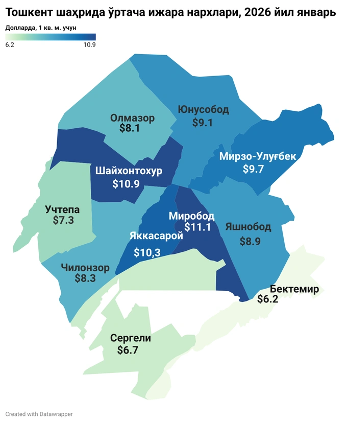 Iqtisodiy tadqiqotlar va islohotlar markazi tahliliga ko‘ra, ijara narxlarining eng yuqori ko‘rsatkichlari Mirobod, Shayxontohur, Yakkasaroy va Mirzo Ulug‘bek tumanlarida qayd etildi. Ushbu tumanlarda 1 kvadrat metr uchun o‘rtacha ijara narxi $11 atrofida.
