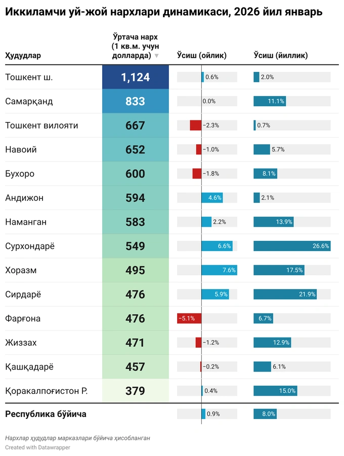 Yanvar oyida O‘zbekiston bo‘yicha uy-joy oldi-sotdi shartnomalari soni 28,6 mingta bo‘lib, o‘tgan yilning mos davriga nisbatan qariyb 12% ga oshdi. Shu bilan birga, ko‘chmas mulk bozorining uchdan biri Toshkentga to‘g‘ri kelib, shahar bo‘yicha savdolar hajmi 33,4% ga o‘sdi. Samarqand va Sirdaryo viloyatlarida ham uy-joy bozorida o‘sish sezilarli bo‘ldi — mos ravishda 26% va 24%.