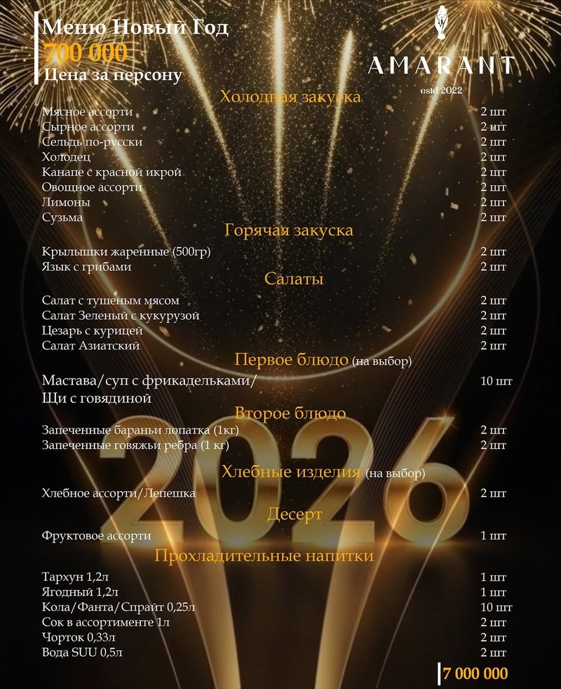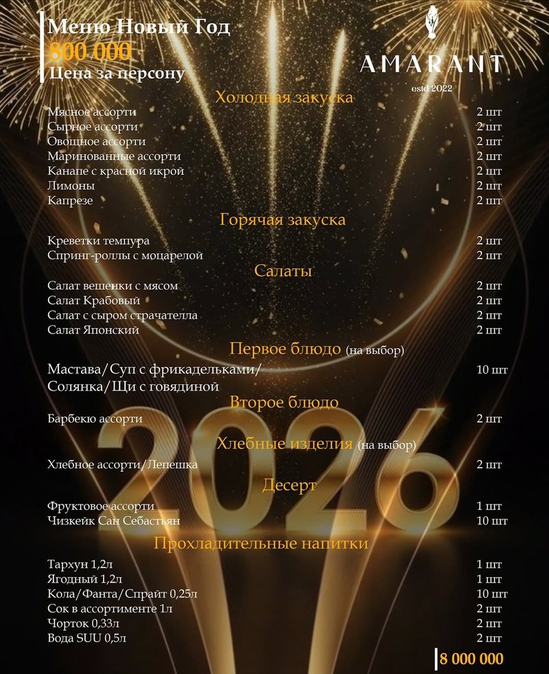 Amarat restorani Toshkentning Chilonzor tumanida joylashgan bo‘lib, bayramona muhit va sifatli xizmat bilan tanilgan. Yangi yil korporativlari uchun ular 3-4 xil menyu paketlarini taklif qiladi: 700 ming so’m, 800 ming so’m va 890 ming so’mgacha. Ular tarkibi, qaysi ovqatlar va desertlar kiritilgani hisobiga bir-biridan farq qiladi.