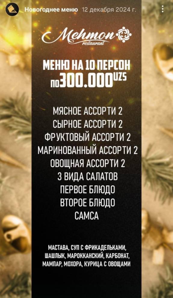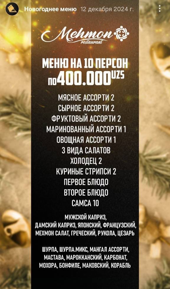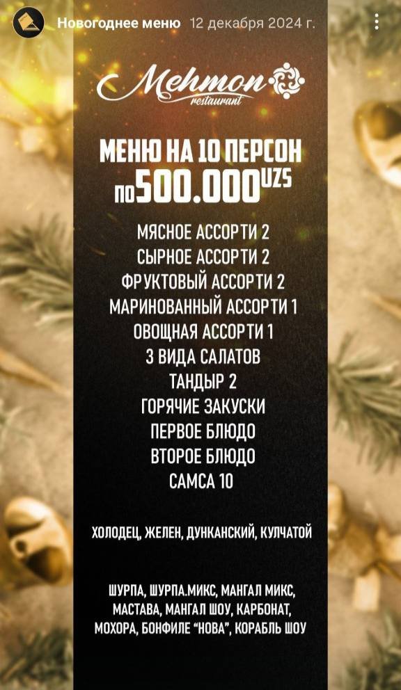 Bundan tashqari yana 2 mashhur restoran ham o’z menyulari haqida ma’lumot berdi. Ulardan biri Retro Milliy restorani bo’lib, ularda yangi yil menyular 700-760 ming so’m atrofini tashkil qiladi.