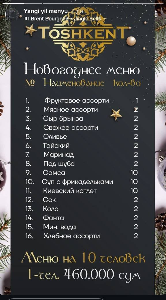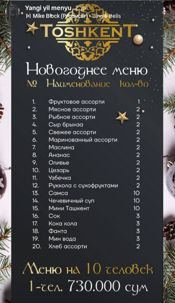 Toshkentning yirik restoranlari yangi yil bayrami uchun qanday banket paketlarini taklif qilmoqda? Menyular qanday va qayerlarda banket o’tkazish mumkin?